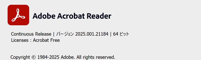以降の説明で使用するバージョンはAdobe Acrobat Reader 2025.001.21184(64bit)です。