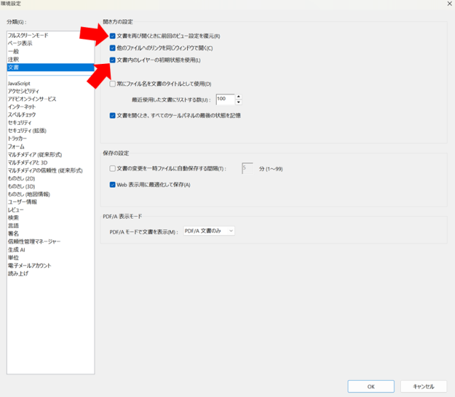 - 文書を再び開くときに前回のビュ ー 設定を復元