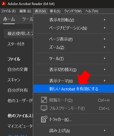 2)Acrobat Reader を起動後、「表示」→ 「新しい Acrobat を有効にする」 を再度選択