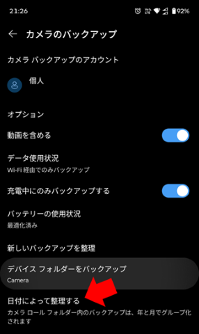 4. 次に年・月ごとに保存するために「日付によって整理する」をタップします。